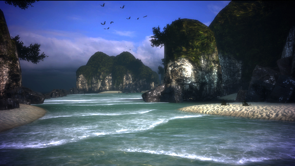 Nous sommes une plage de sable fin, avec des océans émeraudes à perte de vue. Des arbres exotiques ceinturent l'extérieur de l'île et quelques créatures locales étranges nous regardent. Des sortes de crabes avec des pattes plus longues sont poussés par les vagues alors que des sortes de poulets, croisement d'une autruche et d'un vélociraptor miniatures, courent dans le début de plaine juste à côté d'une forêt. Un sentier pavé avec des motifs complexes nous mene jusqu'à l'hôtel (le palace ouais !) ou des servantes, des majordomes et des porteurs nous attendent.